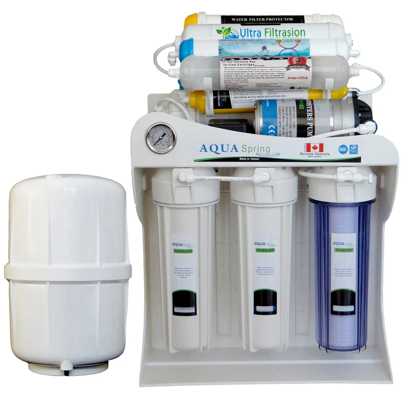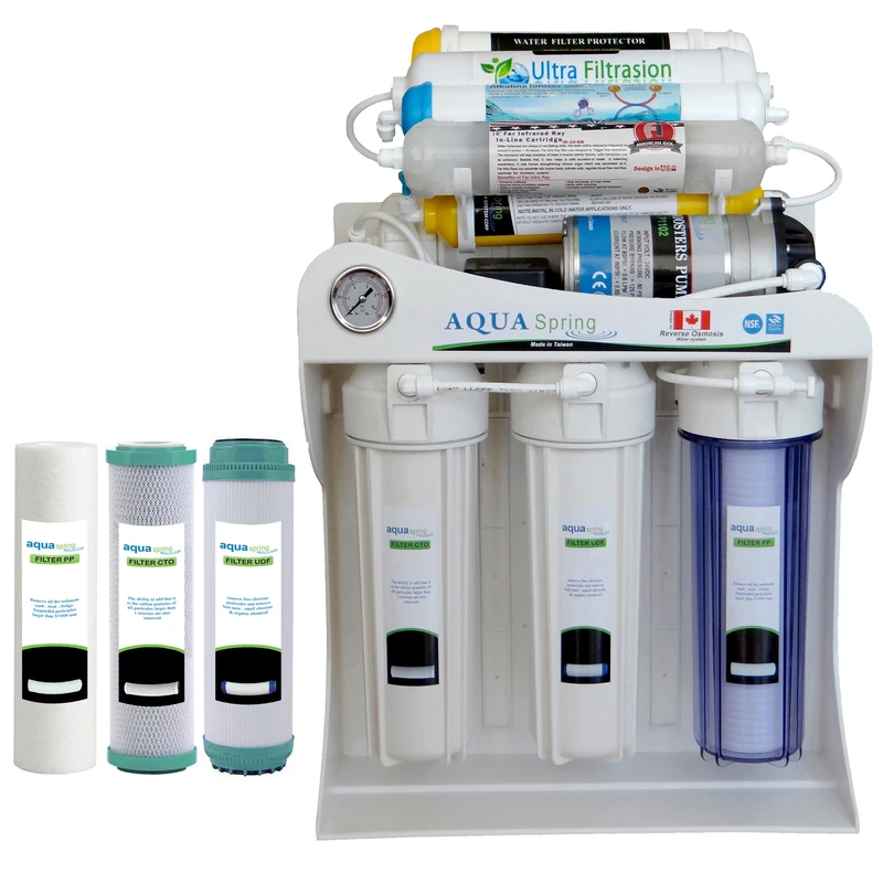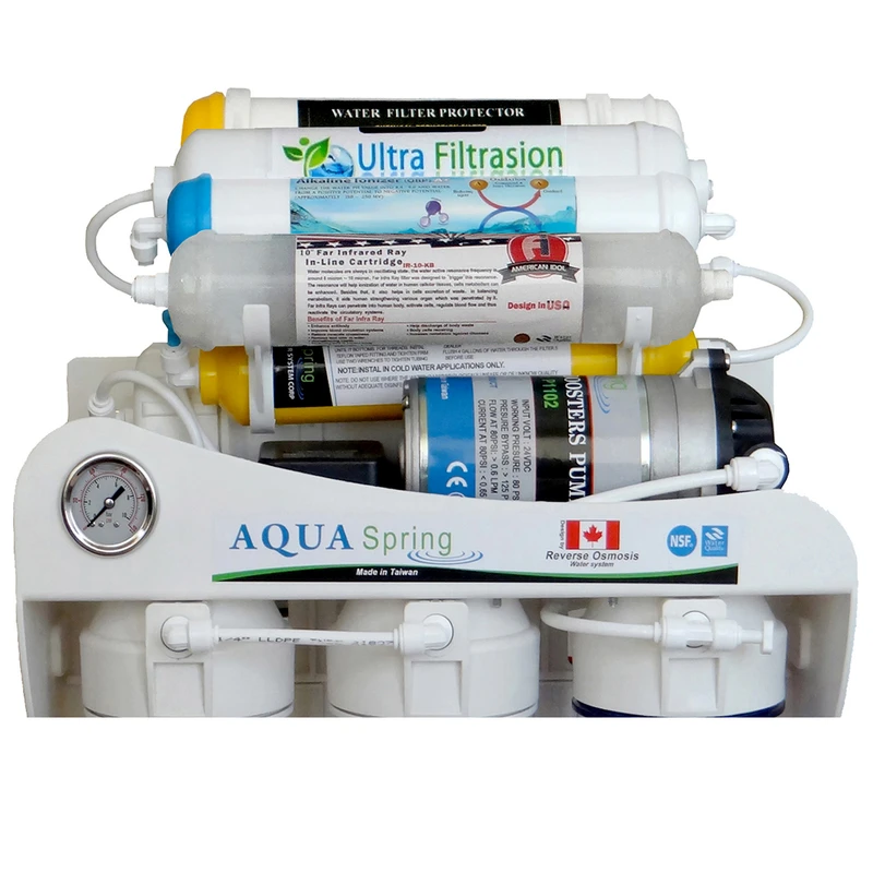 دستگاه تصفیه کننده آب آکوآ اسپرینگ مدل UF – SF4800 به همراه فیلتر تصفیه آب کد 01 مجموعه 3 عددی با برند معتبر اکوآاسپرینگ مجهز به مکانیزم دوگانه مدل UF – SF4800 ده مرحله‌ای و دارای با‌کیفیت‌ترین و بروزترین تکنولوژی در فرایند دستگاه‌های تصفیه‌آب خانگی است. آب شرب دارای مقادیر زیادی املاح و آلودگی است. این آلودگی‌ها قابل رویت نیستند بلکه فقط با آزمایش تشخیص داده می‌شوند. به‌همین علت اخیرا استفاده از دستگاهای تصفیه‌آب خانگی در کشورمان به‌یک امر ضروری مبدل شده است چرا‌که آب آلوده منشاء اصلی اکثر بیماری‌هاست.این دستگاه از متریال و هوزینگ‌های فودگرید، فیلترهایی بر‌پایه گیاهی، مخزن آنتی‌باکتریال 16 لیتری، مگا‌بوستر پمپ قوی بافشار 125 PSI و شیر جداگانه برخوردار است. عملکرد فیلترهای این دستگاه در سه‌مرحله اول به‌این‌صورت است که کلیه املاح معلق و مضر، کلر، آفت‌کش‌ها و شوری را از آب گرفته و در‌مرحله بعد نیترات، نیتریت، جیوه و میکرو‌ارگانیسم‌های شیمیایی و فلزات سنگین (کلیه املاح سرطان زا) را به‌طور کامل از آب می‌گیرد. سیستم اولترافیلتراسیون تکنولوژی جداسازی ذرات معلق تا 0/01 میکرون با غشاهای میان تهی از جنس پلی پروپلین بر پایه گیاهی گفته می شود. دستگاه فوق دارای فیلتر اکسیژن ساز است که به وسیله سنگ های بیوسرامیک و شکست مولکولی آب سطح میزان اکسیژن آب را افزایش می دهد. در این دستگاه از مرغوب ترین فیلتر قلیایی ساز(یونایزر) استفاده شده است. این فیلتر با استفاده از فرآیند الکترولیز اجزای اسیدی و قلیایی آب را جدا می کند تا PH آب را افزایش دهد. در مطالعات اخیر اثبات شده است که نوشیدن آب قلیایی موجب سلامت پوست و مو ، بهبود عملکرد روده ، کبد و سیستم ایمنی بدن ،سم زدایی بدن ، کاهش وزن، کاهش قند خون در افراد دیابتی و … خواهد شد. دستگاه فوق دارای شیر مجزا، مخزن ذخیره مجزای آنتی باکتریال از بهترین و معتبرترین دستگاه های ارائه شده در بازار است. کلیه محصولات نشان گر کیفیت و سلامت محصول اروپا را دارا هستند و استانداردهای NSF – ISO – FDA – WATER QUALITY – CE را کسب کرده اند